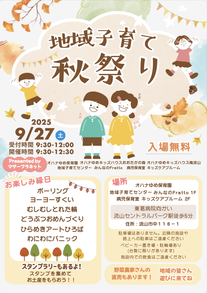 2025年9月27日(土)、当園運営法人の流山エリアにある5施設合同で「地域子育て秋祭り」を開催します!